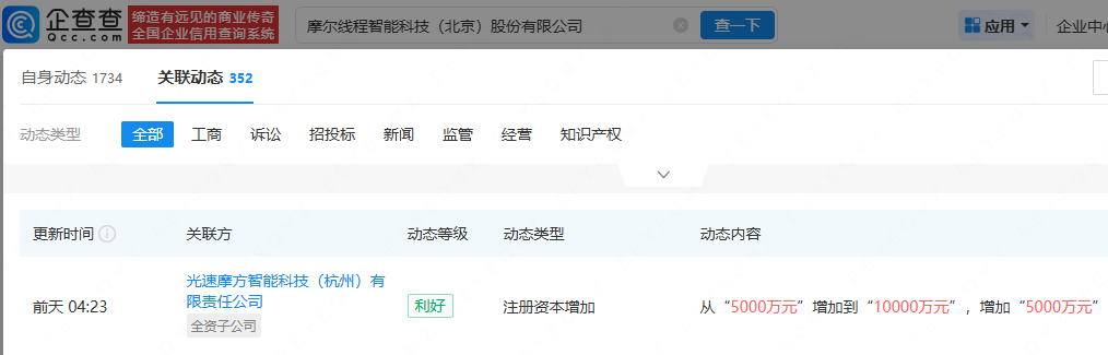 近日,摩尔线程(688795)全资子公司光速摩方智能科技(杭州)有限责任公司发生工商变更灿星财富,注册资本增加至1亿元,增幅为100%。企查查显示,光速摩方智能科技(杭州)有限责任公司成立于2025年3月,法定代表人为王东,经营范围包含:集成电路设计;集成电路芯片设计及服务;信息系统集成服务;集成电路销售等。今日,被誉为“国产GPU第一股”的摩尔线程于科创板上市。