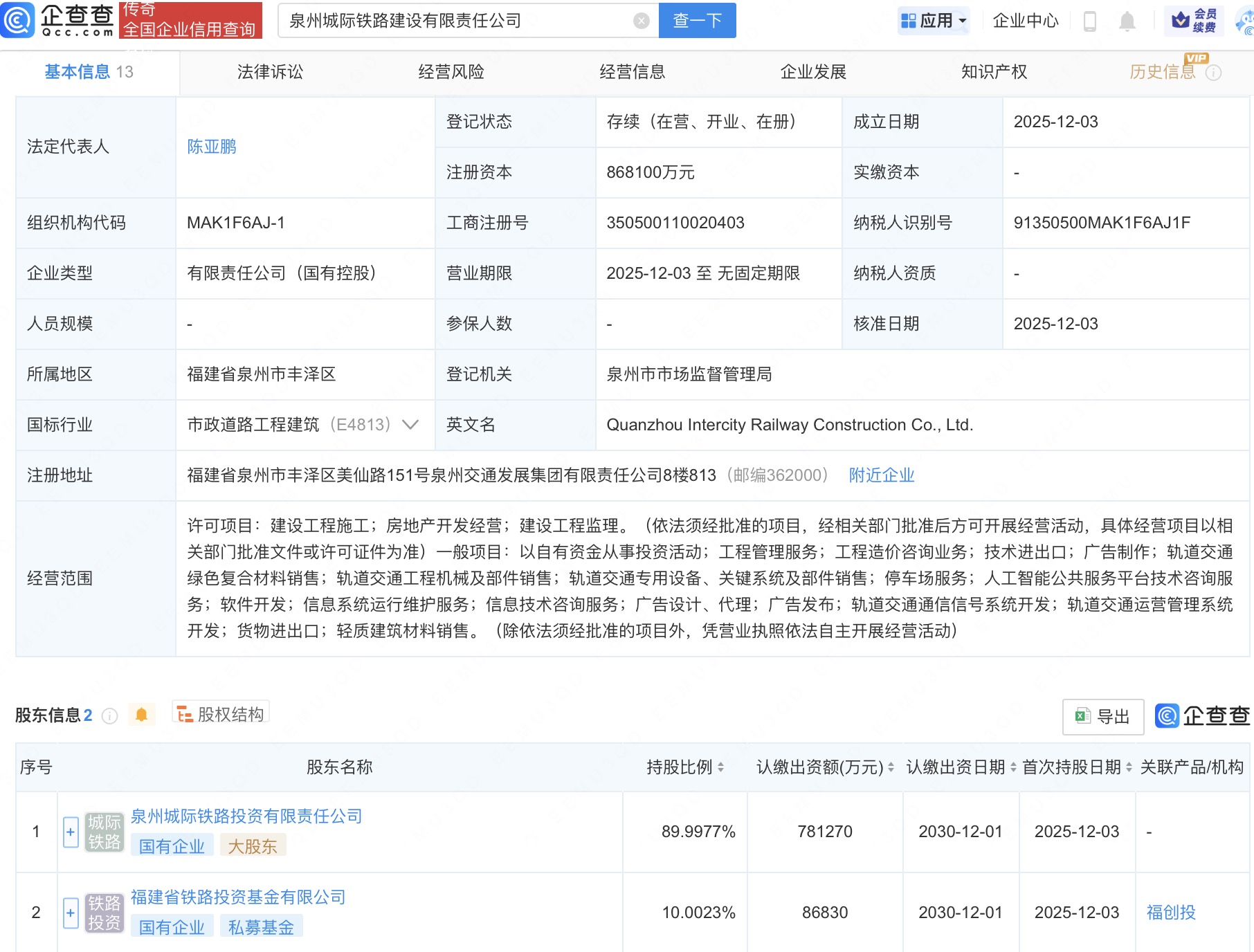 近日,泉州城际铁路建设有限责任公司成立,法定代表人为陈亚鹏,注册资本86.81亿人民币优配股,经营范围包括建设工程施工、房地产开发经营、建设工程监理、以自有资金从事投资活动等。企查查股权穿透显示,该公司由泉州城际铁路投资有限责任公司、福建省铁路投资基金有限公司共同持股。